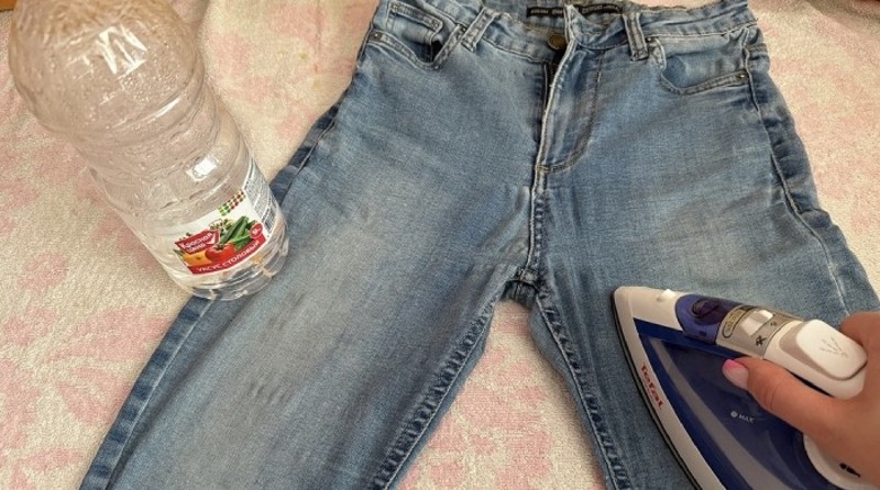 Pradžiai reikia ištemptas džinsų vietas apipurkšti actu. Nekreipkite dėmesio į kvapą, nes jis pakankamai greitai išsivėdins. Po to reikia paimti įkaitintą lygintuvą ir sukamaisiais judesiais perbraukti per problemiškas vietas. Rezultatas jus nustebins. Actas leis ištemptiems pluoštams užimti ankstesnę padėtį, o karštas lygintuvas juos užfiksuos reikalingoje formoje.